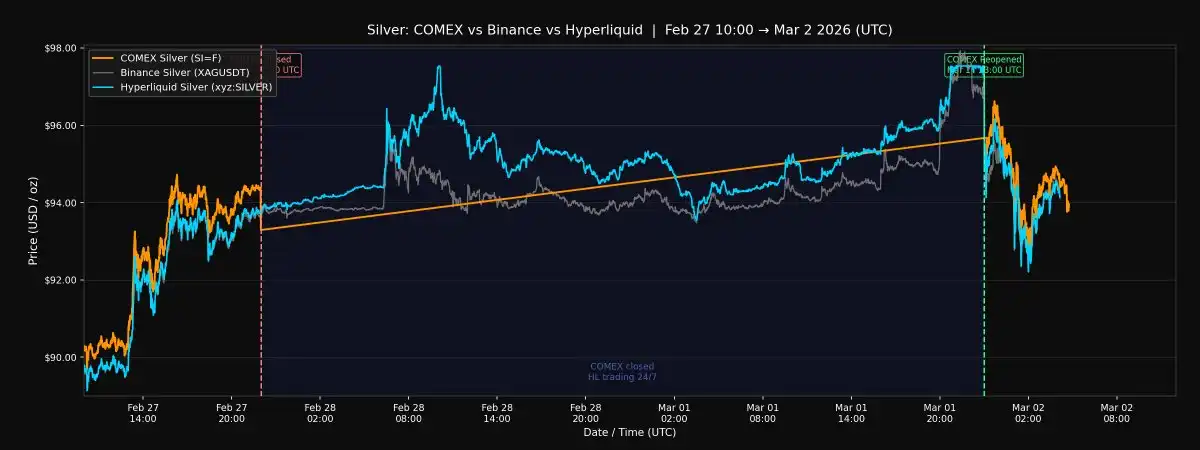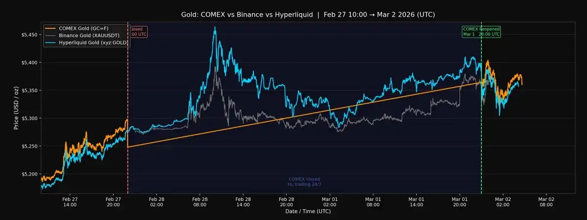 这个周末地缘政治风险爆发时,COMEX 休市了,但 Hyperliquid 和 Binance 没有。两家平台持续交易黄金和白银永续合约。我对比了 Hyperliquid 的 Trade.xyz 和 Binance 相对于 COMEX 的定价,观察哪个场所先动,哪个在重开时更接近实际价格。