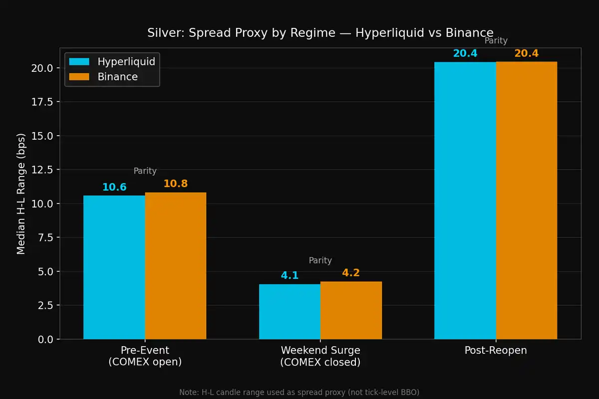 在黄金方面,Hyperliquid 的价差持续更窄。事件前,Hyperliquid 平均点差为 2.9 个基点,Binance 为 3.7 个基点。周末波动期间,Hyperliquid 平均 1.9 个基点,Binance 2.6 个基点。重开后两个平台点差均有所扩大,但 Hyperliquid 仍更窄,为 6.4 个基点,Binance 为 8.2 个基点。