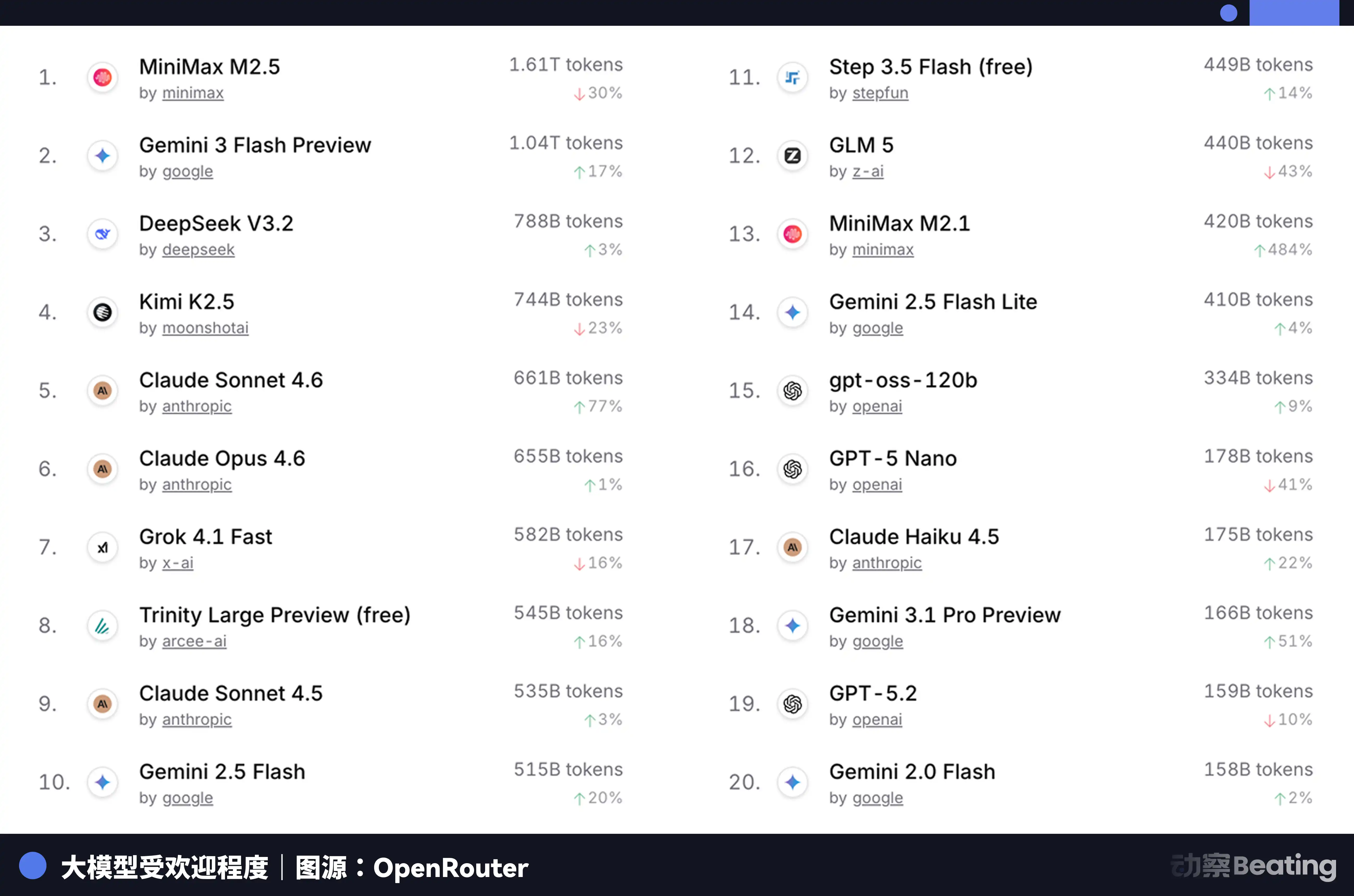 这个价格差,在全球开发者市场上反响巨大。2026 年 2 月,全球最大的 AI 模型 API 聚合平台 OpenRouter 上,中国 AI 模型的周调用量在三周内暴涨 127%,首次超越美国。一年前,中国模型在 OpenRouter 上的份额不足 2%。一年后,增长了 421%,逼近六成。