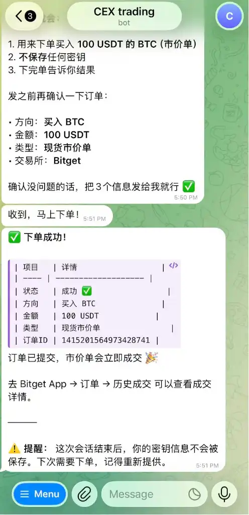 一个值得提的设计:Agent 明确说明不保存任何密钥信息,对话结束后密钥不留存,下次下单需要重新提供。这对安全性来说是合理的处理方式。