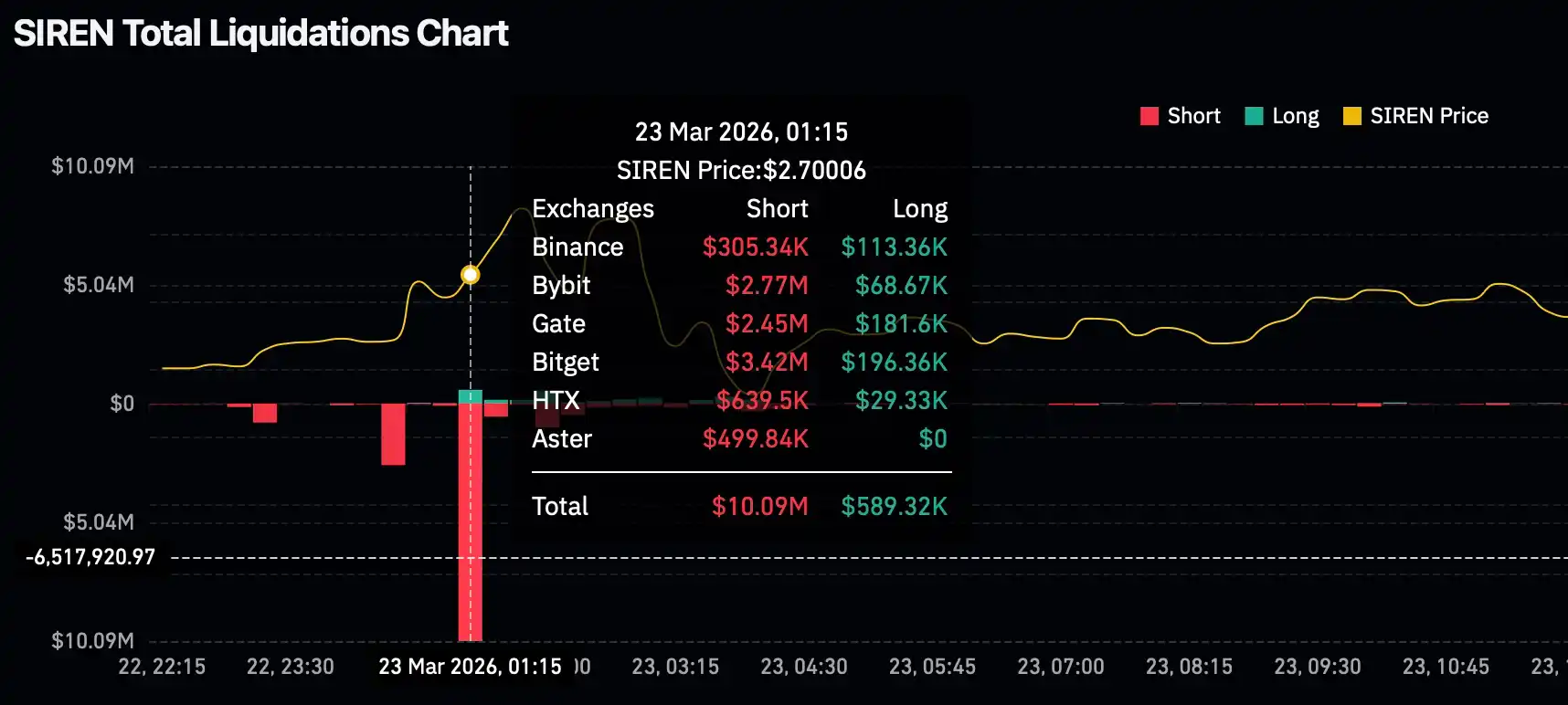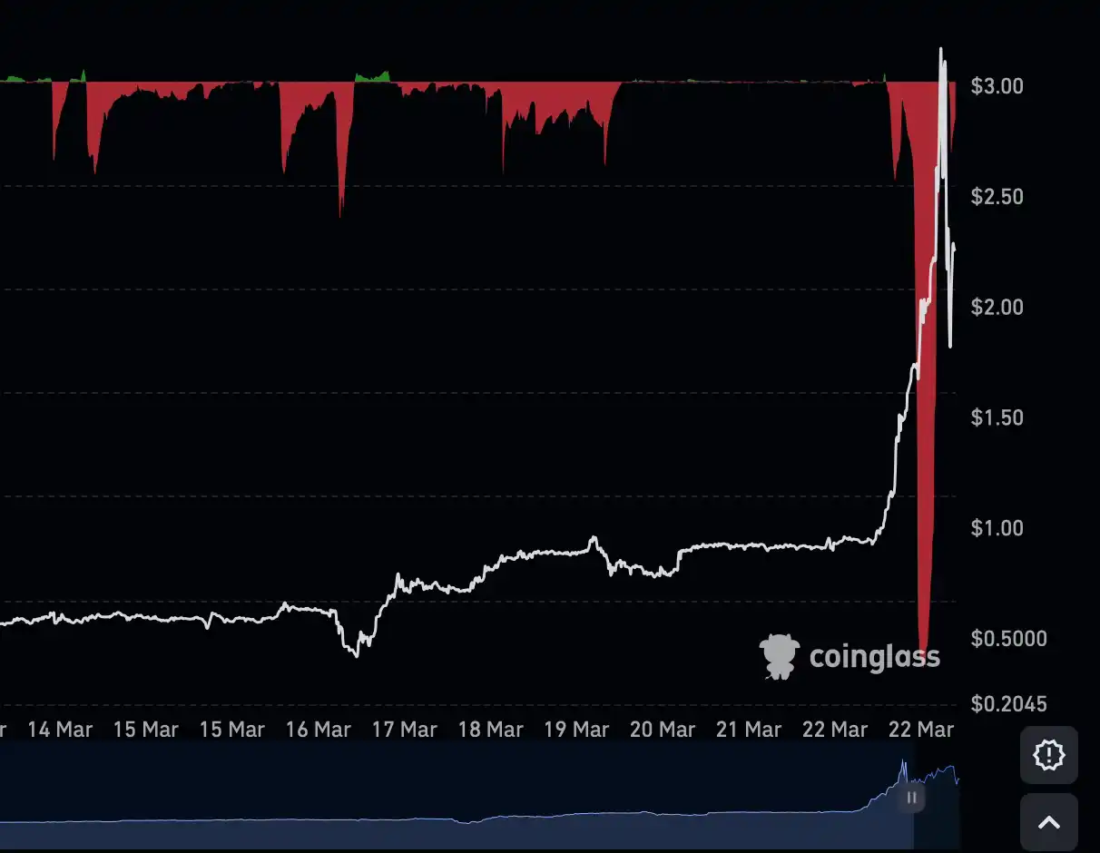 从上面的费率图可以看到,从 3 月 14 日开始,$SIREN 经常出现较高的负费率,空头持续给庄家的多单送钱,庄家又利用这些「免费」的资金继续推高价格。在 3 月 23 日凌晨,Gate 现货上又在 10 分钟内出现了 78% 的剧烈波动,对应成交额仅为约 45 万美元,$SIREN 的价格从 2.75 美元一度接近 5 美元。这意味着,有不少人被爆了。