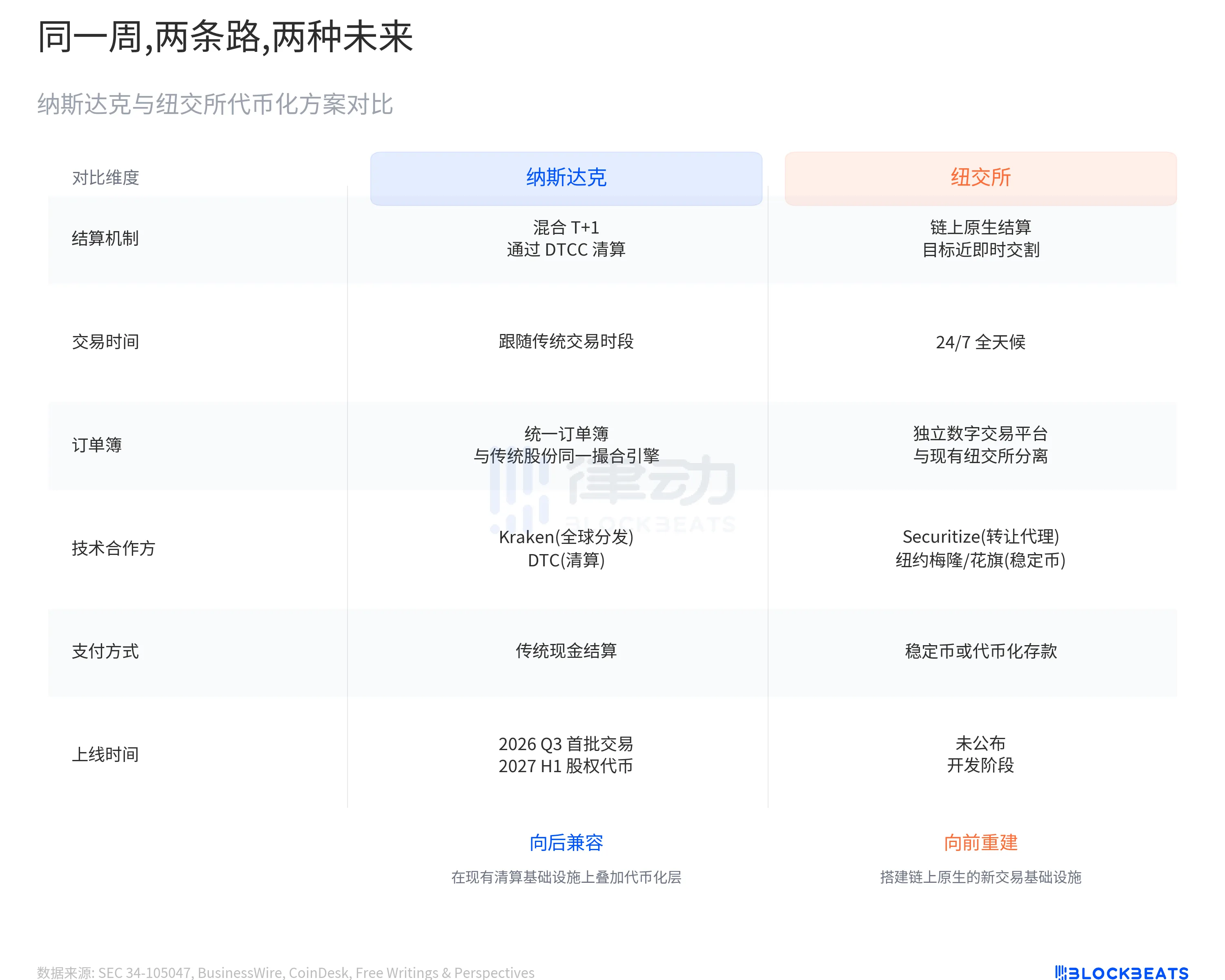 这些交易所大多花了两到三年从试点推进到部分上线。纳斯达克从 SEC 批准到预计首批交易只隔一个季度,纽交所从签 MOU 就直接瞄准链上原生结算。SDX 跑了五年做到的事,美国两大交易所用一个月走到了各自的起跑线上。纳斯达克在现有地基上加了一层,纽交所在旁边打了一块新地基。
