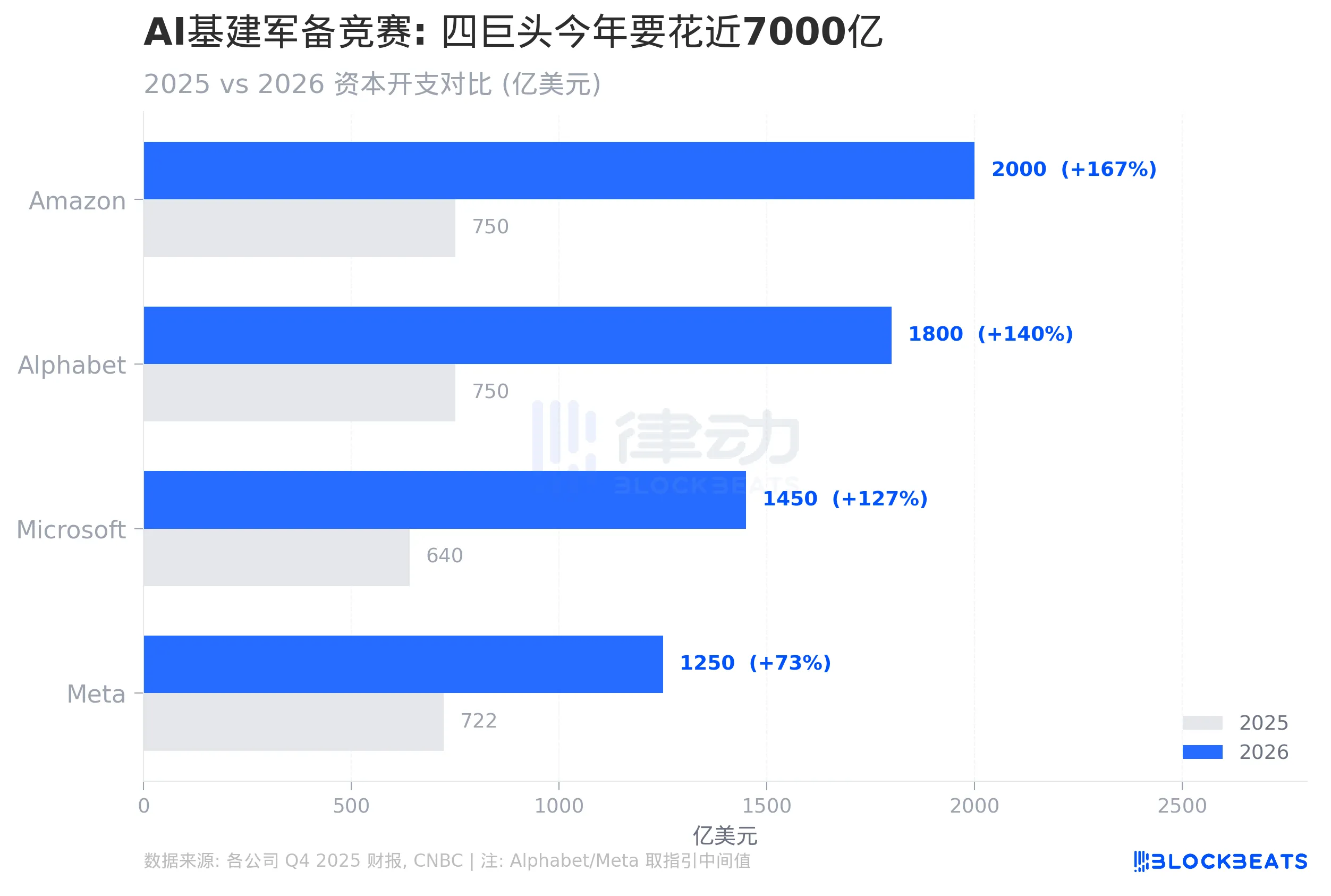 据各公司 Q4 2025 财报及公开指引,亚马逊、谷歌、微软、Meta 四家公司 2026 年的资本开支合计将达到约 6,500 亿美元,同比增长约 130%。其中亚马逊约 2,000 亿美元(同比增长 167%),谷歌约 1,750 至 1,850 亿美元(增长 140%),微软年化约 1,450 亿美元(增长 127%),Meta 为 1,150 至 1,350 亿美元(增长 73%)。