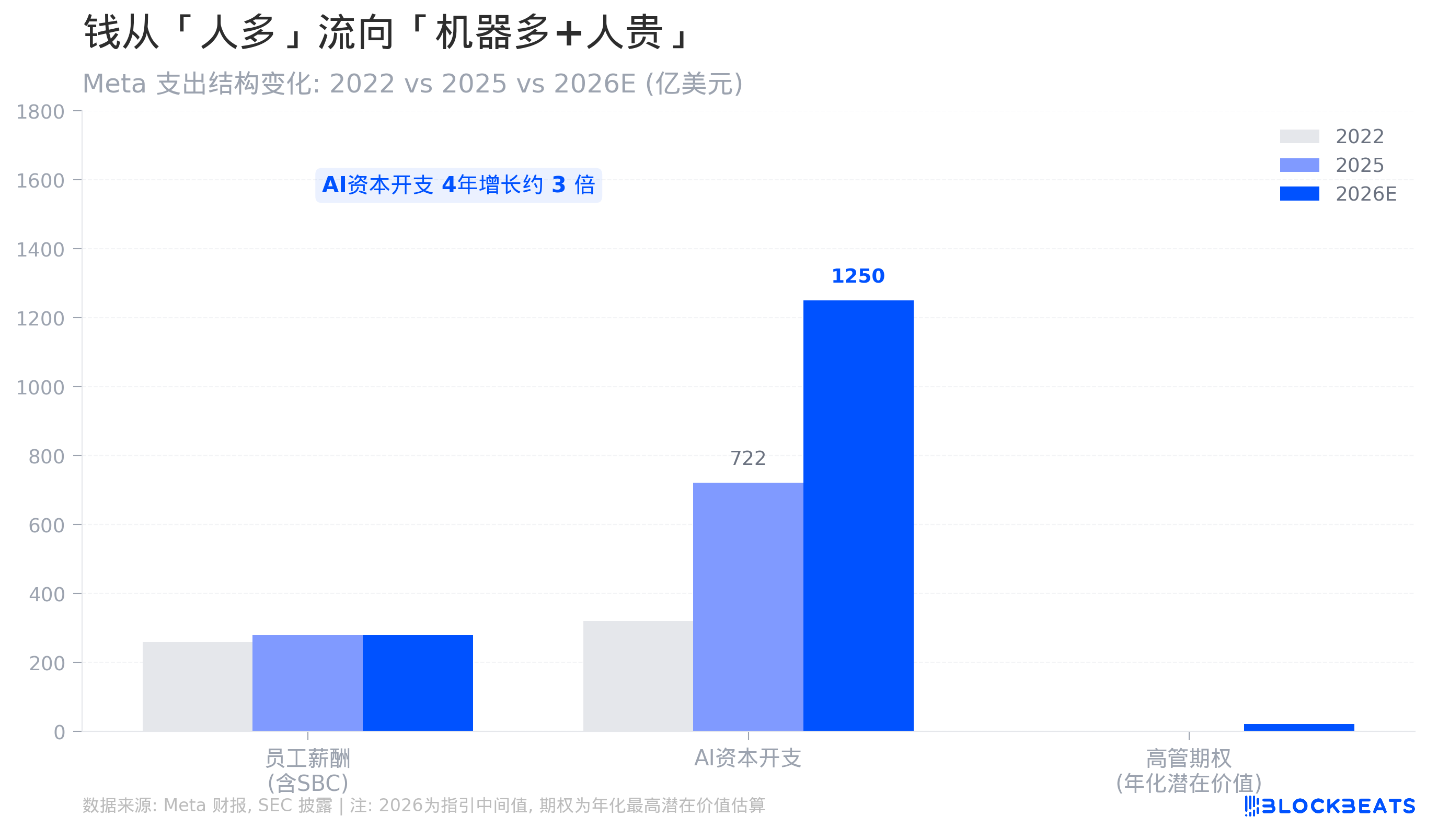 把三件事放在一起看,Meta 的逻辑是一个简单的资源配置公式。员工总薪酬(含股权激励)在 2022 年和 2026 年基本持平,都在 260 至 280 亿美元左右。但 AI 资本开支从 320 亿美元飙升到 1,250 亿美元,四年增长约 3 倍。与此同时,一个全新的高管期权池出现了,把最核心的六个人锁定在未来五年。