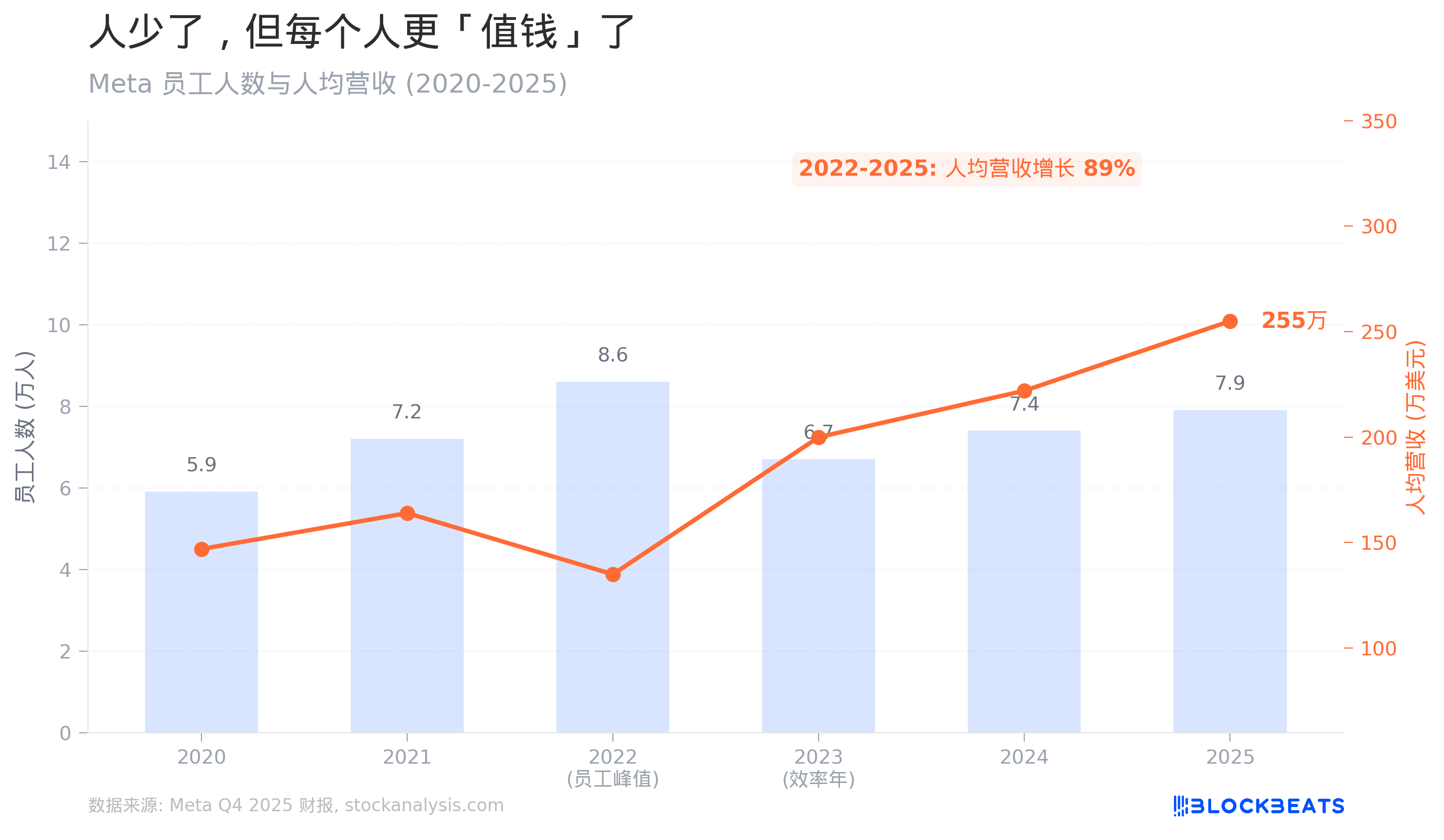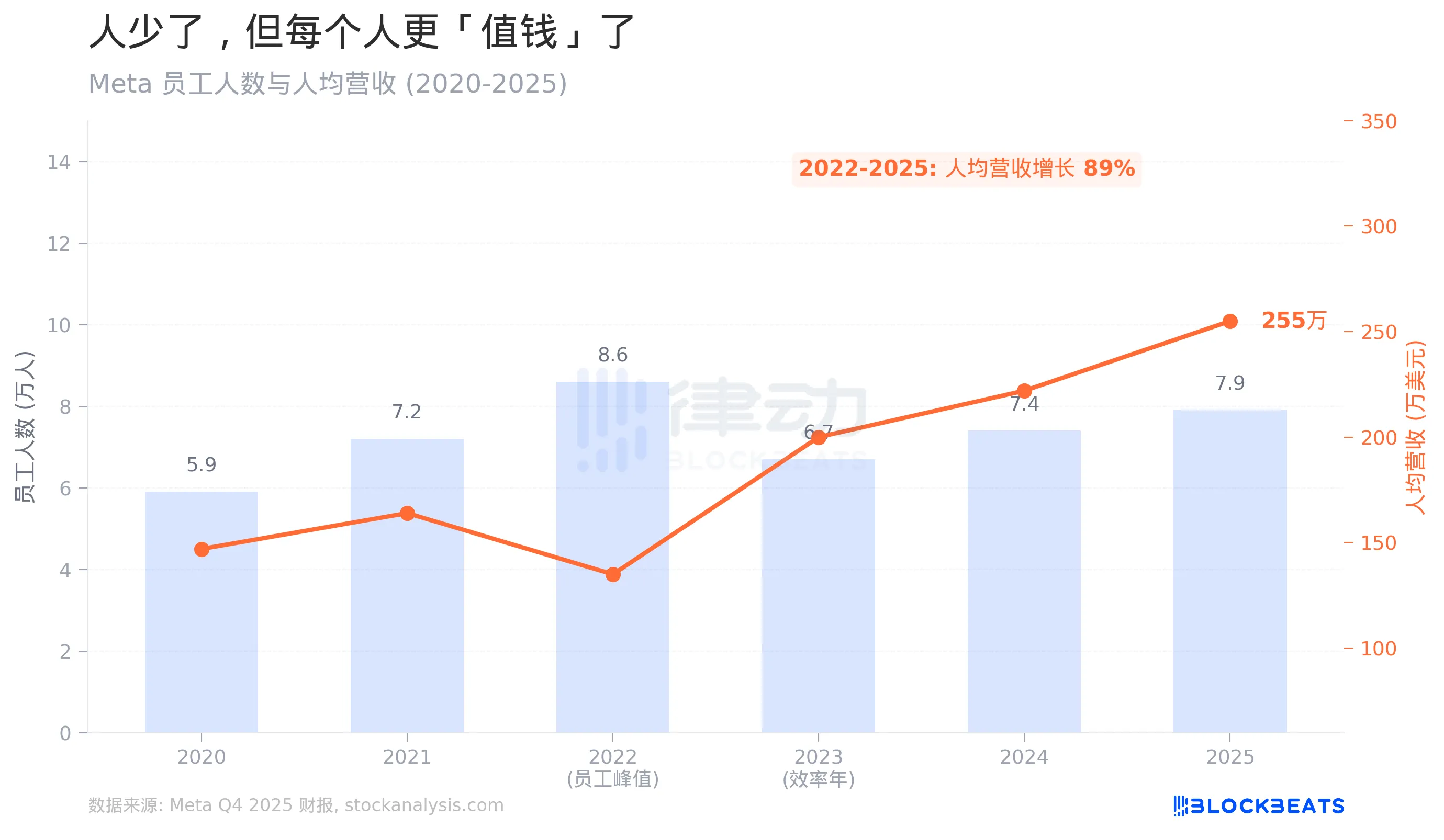 效率的结果写在数字里。据 Meta Q4 2025 财报,到 2025 年底公司有 78,865 名员工,比峰值少了近 8,000 人。但同期年营收从 1,166 亿美元增长到 2,010 亿美元,涨了 72%。人均营收从 135 万美元飙到 255 万美元,增长 89%。