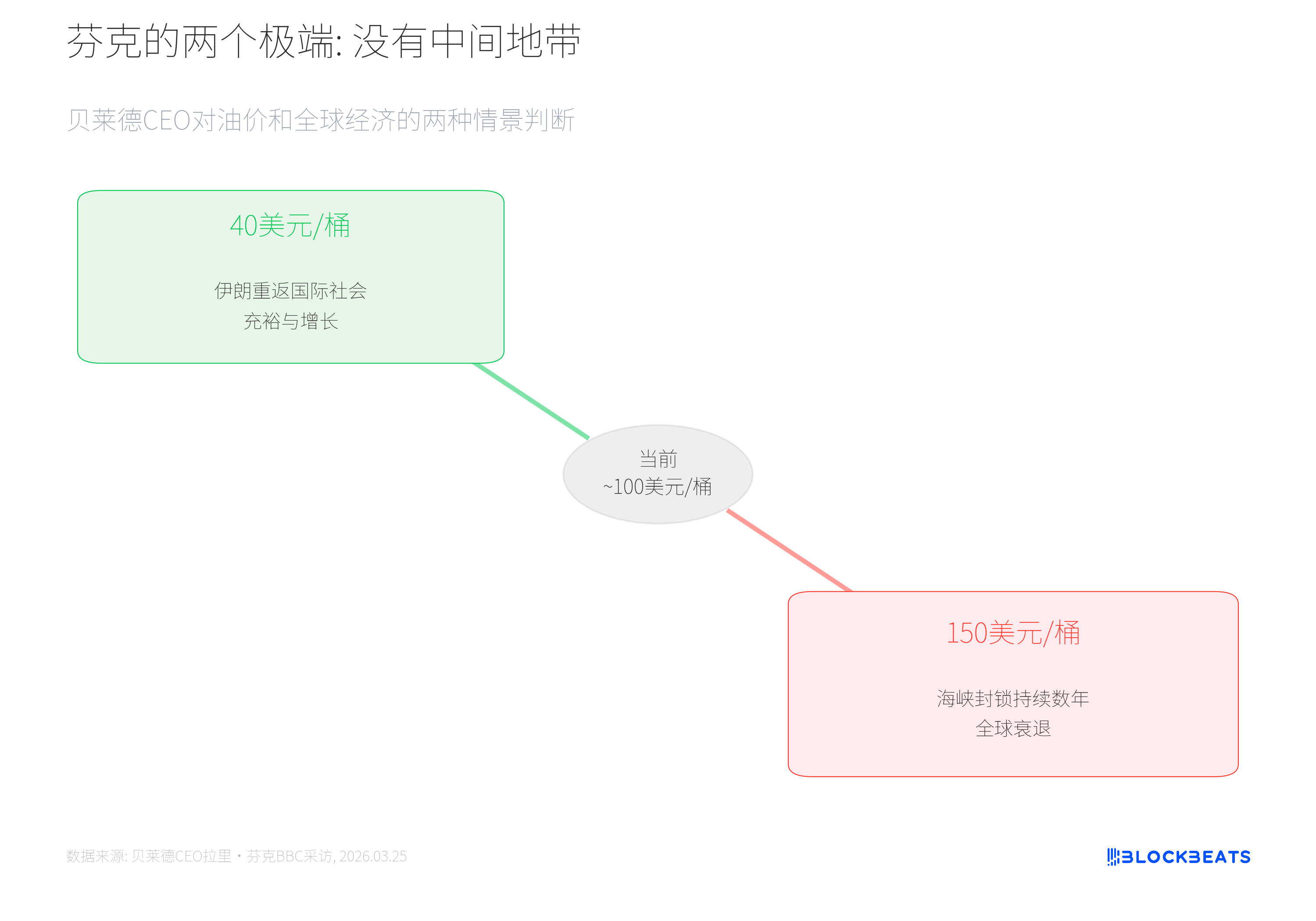 第一种情景,伊朗被国际社会接纳,重新参与全球贸易,石油供应恢复,油价降至 40 美元/桶,全球迎来增长。第二种情景,冲突持续,海峡封锁延续数年,油价在 100 美元以上甚至接近 150 美元,全球进入衰退。芬克特别指出,高油价的连锁反应会传导到农产品和化肥,因为这两者是天然气的副产品。