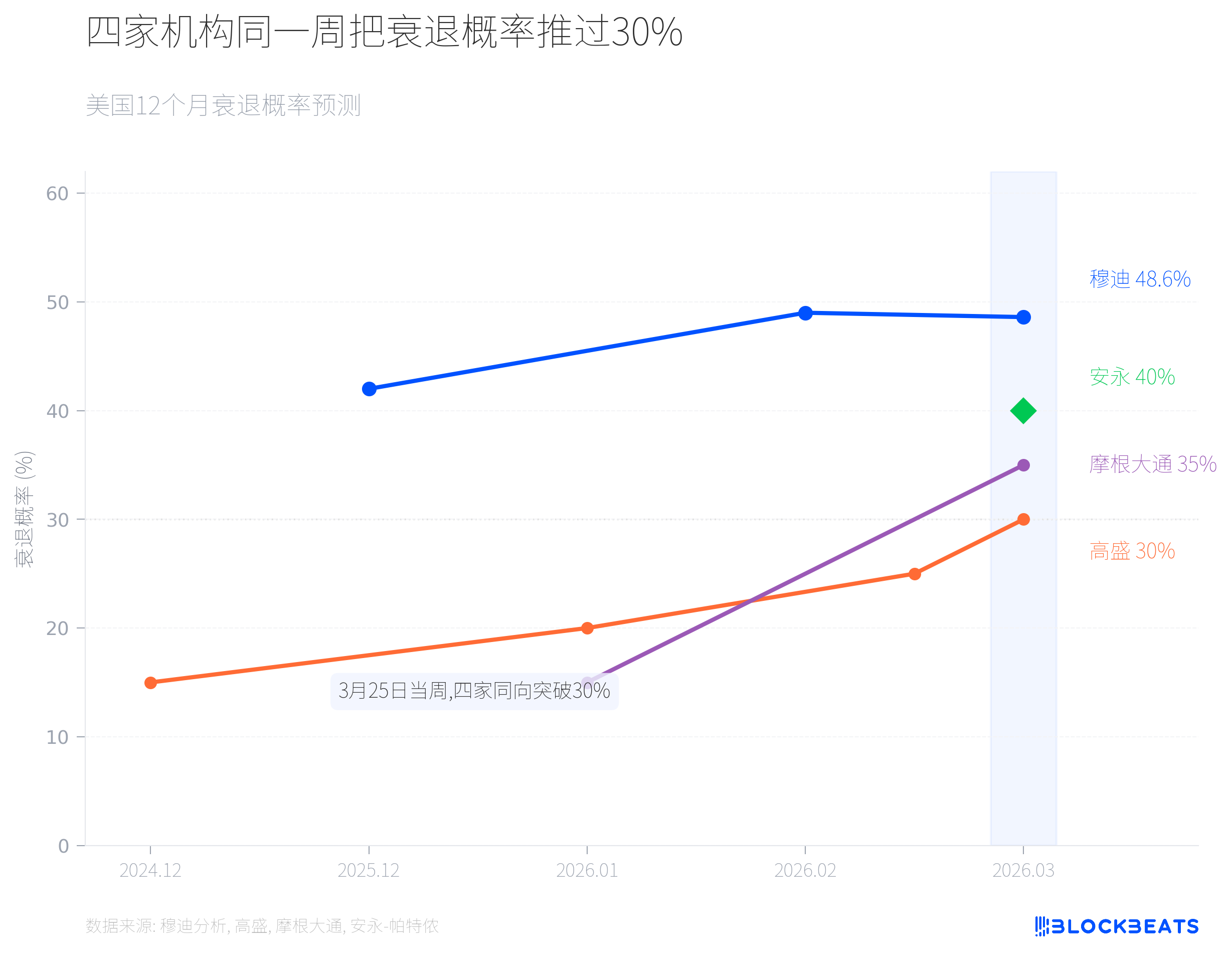 3 月 25 日这一周,穆迪分析、高盛、摩根大通、安永-帕特侬四家使用不同方法论的机构,不约而同地把美国未来 12 个月的衰退概率上调至 30% 以上。穆迪给出 48.6%,安永-帕特侬 40%,摩根大通 35%,高盛 30%。