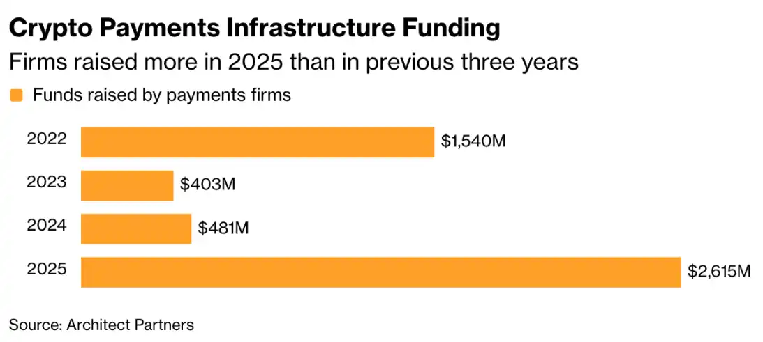 据专注加密融资年度报告的 Architect Partners 数据,2025 年加密支付类公司融资总额飙升至 26 亿美元,超过此前三年的总和。在万事达卡收购 BVNK 的带动下,今年这一数字预计还将继续攀升。