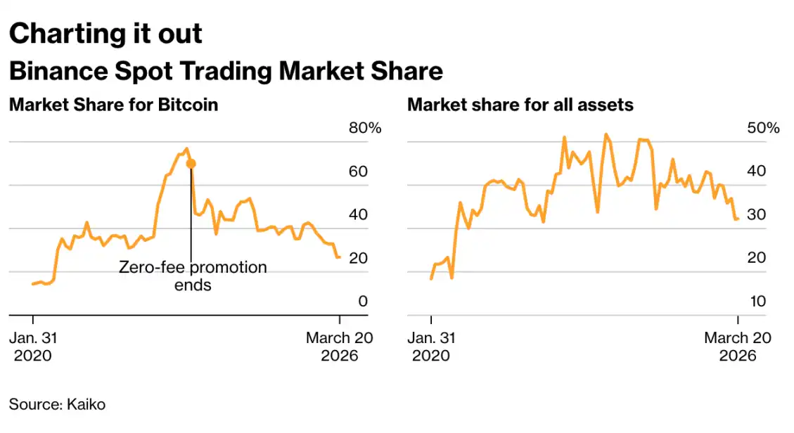 截至今年 2 月,Binance 在比特币现货交易中的份额已降至 27%(该数据因统计口径不同存在一定差异),全币种交易份额从 52% 跌至 32%。其利润最高的衍生品业务份额同样大幅下滑,降至 34%。