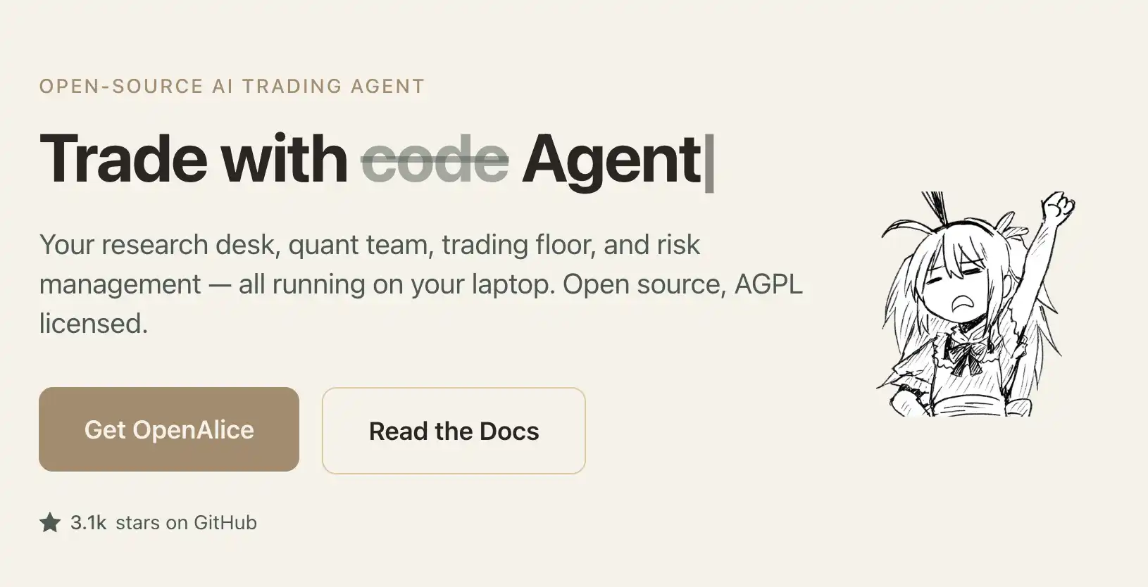 它是一个开源的 AI 交易代理引擎,完全跑在本地,24 小时不停。官方的说法是「你的研究台、量化团队、交易大厅和风控部门」。官方的定位是:「你的一人制华尔街」。