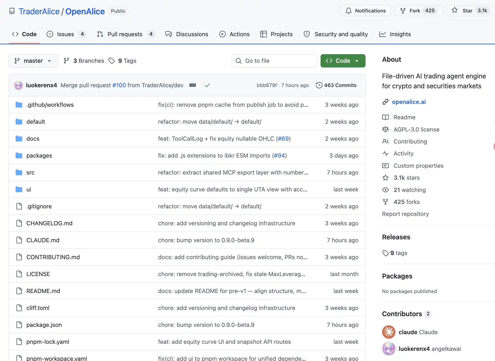 目前 OpenAlice 在 GitHub 上有 3100 多 star,425 个 fork,463 次提交。