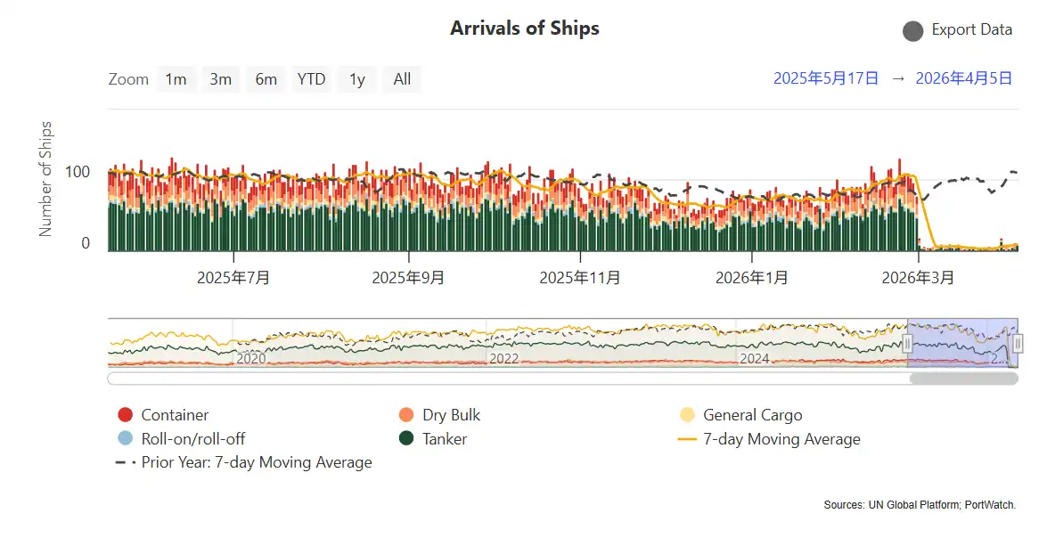 开战以来,全球航运数据机构 IWF 的数据显示,过境霍尔木兹海峡的船只从战前移动平均约 100 艘,骤降至近三周的平均不足 5 艘——降幅超过 95%。