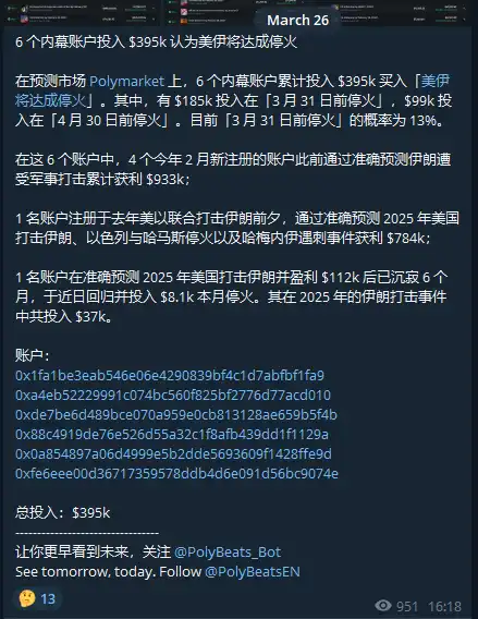 然而有一波人早在上个月就已经开始对本次的停火进行布局。北京时间 3 月 26 日,预测市场监控频道 PolyBeats 推送了一条快讯: