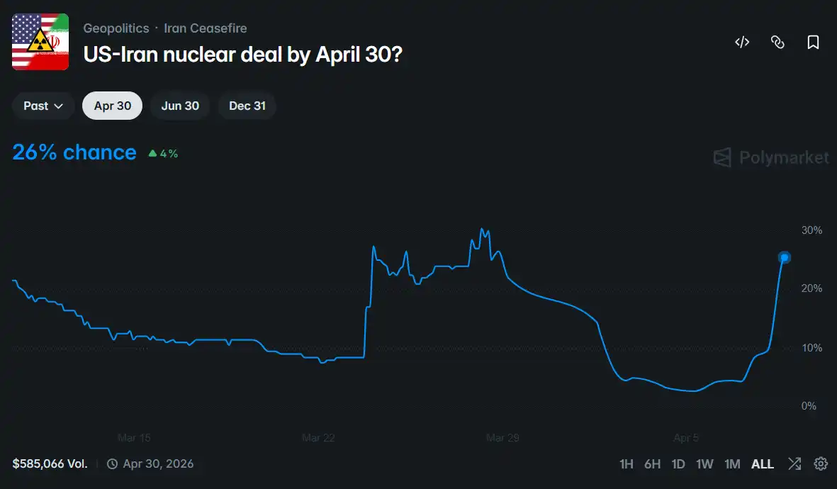 预测市场上「美伊核协议 4 月 30 日前达成」的概率,在停火公告发出前仅为 2%,停火落地后已升至 26%。