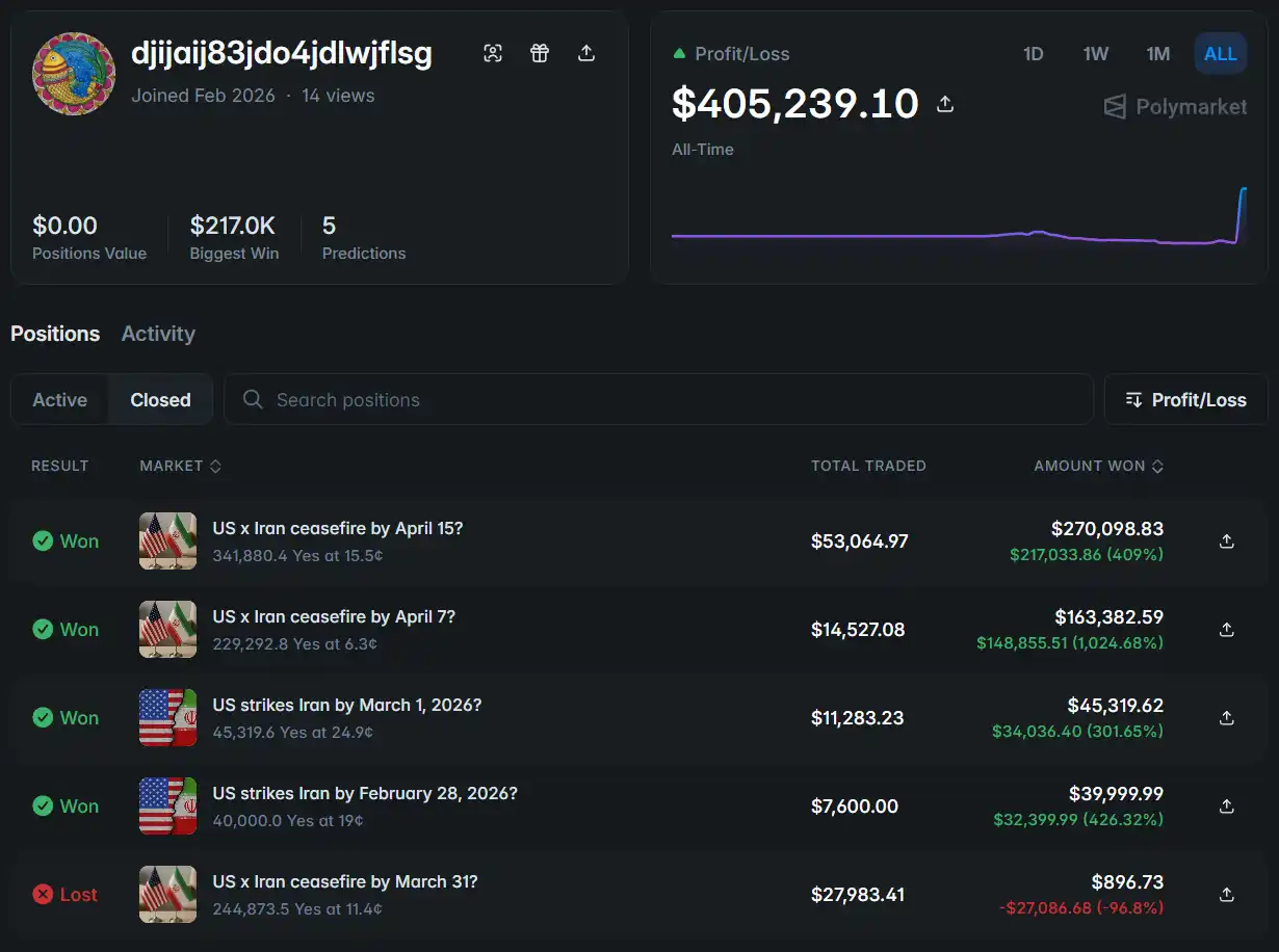 4 个于今年 2 月新注册的账户,在本轮伊朗冲突中精准押中美以打击伊朗的时间节点,累计获利近 100 万美元;1 个注册于 2025 年 6 月的账户,押中了去年的以色列-伊朗战争、以色列-哈马斯停火以及伊朗前最高领袖哈梅内伊遇刺,累计获利 78 万美元;还有 1 个账户,在 2025 年的「十二日战争」事件中精准押中打击时间,在获利 11 万美元后沉寂了整整 6 个月,近日重新回归并押注本轮停火。