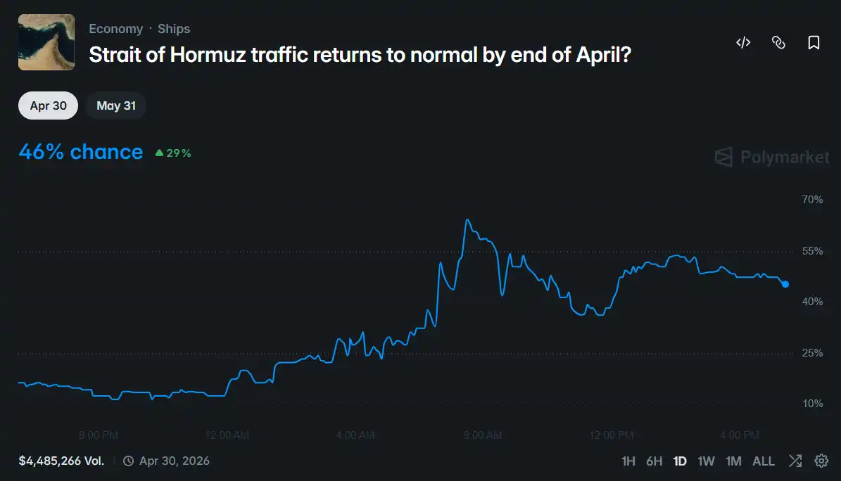 预测市场「霍尔木兹海峡是否会在本月恢复通行」的概率也做出了相似的反应:停火协议的宣布使得原本 14% 的概率最高冲至 65%,目前 46%。