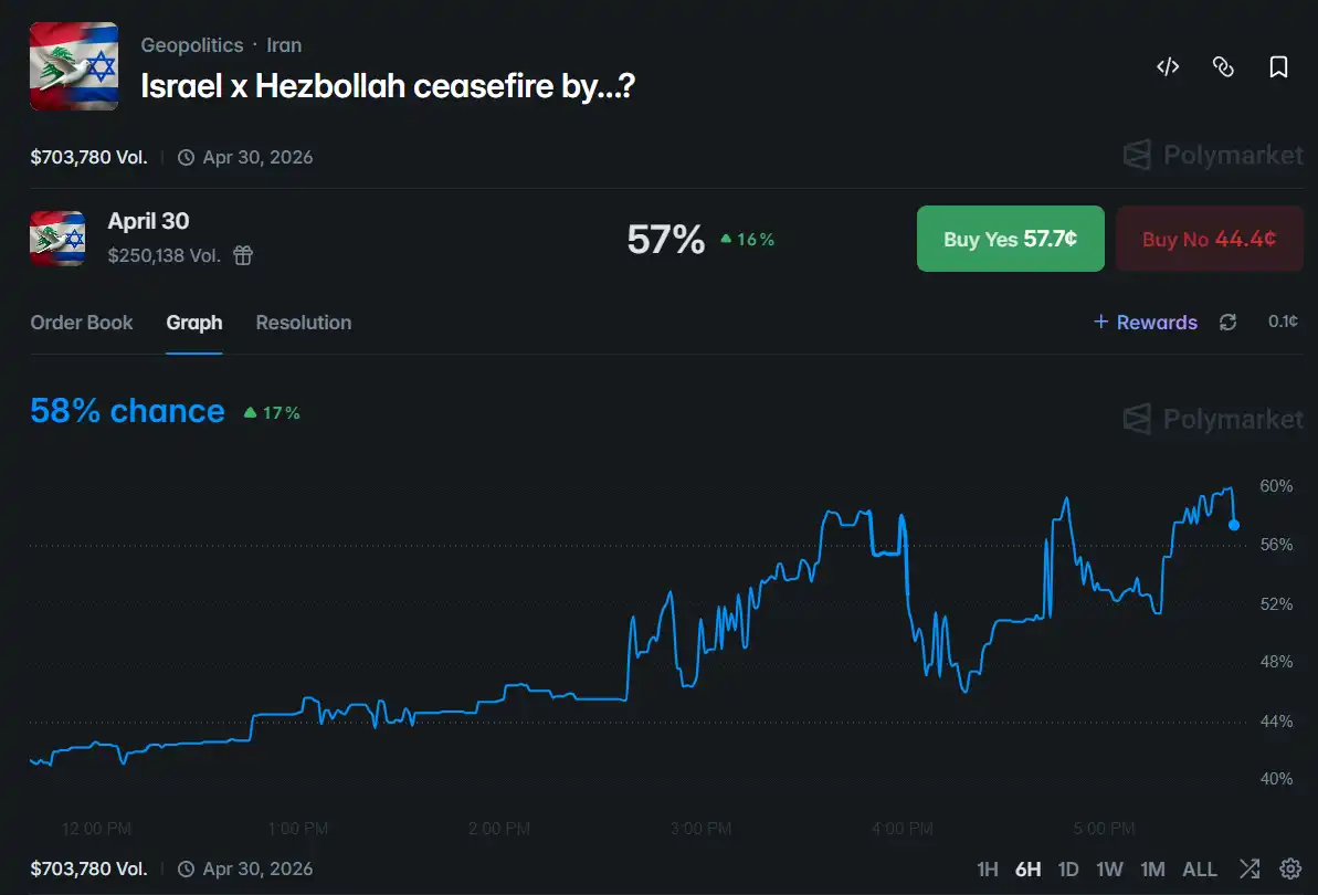 预测市场上「以色列-真主党于本月停火」的概率目前约为 56%。这一定价折射出一个现实:就算美伊两国的停火协议文本里写明了「包括黎巴嫩」,以色列是否真的会收手,是另一个完全独立的变量。