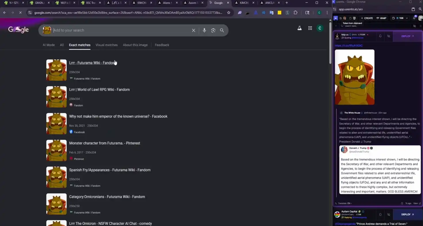 toly 想表达什么?不重要。clukz 在视频中自言自语了一句「这是啥?」,然后立马用 Google 搜索了这张图片,发现 toly 所发送图片对应的形象叫「Lrrr」。