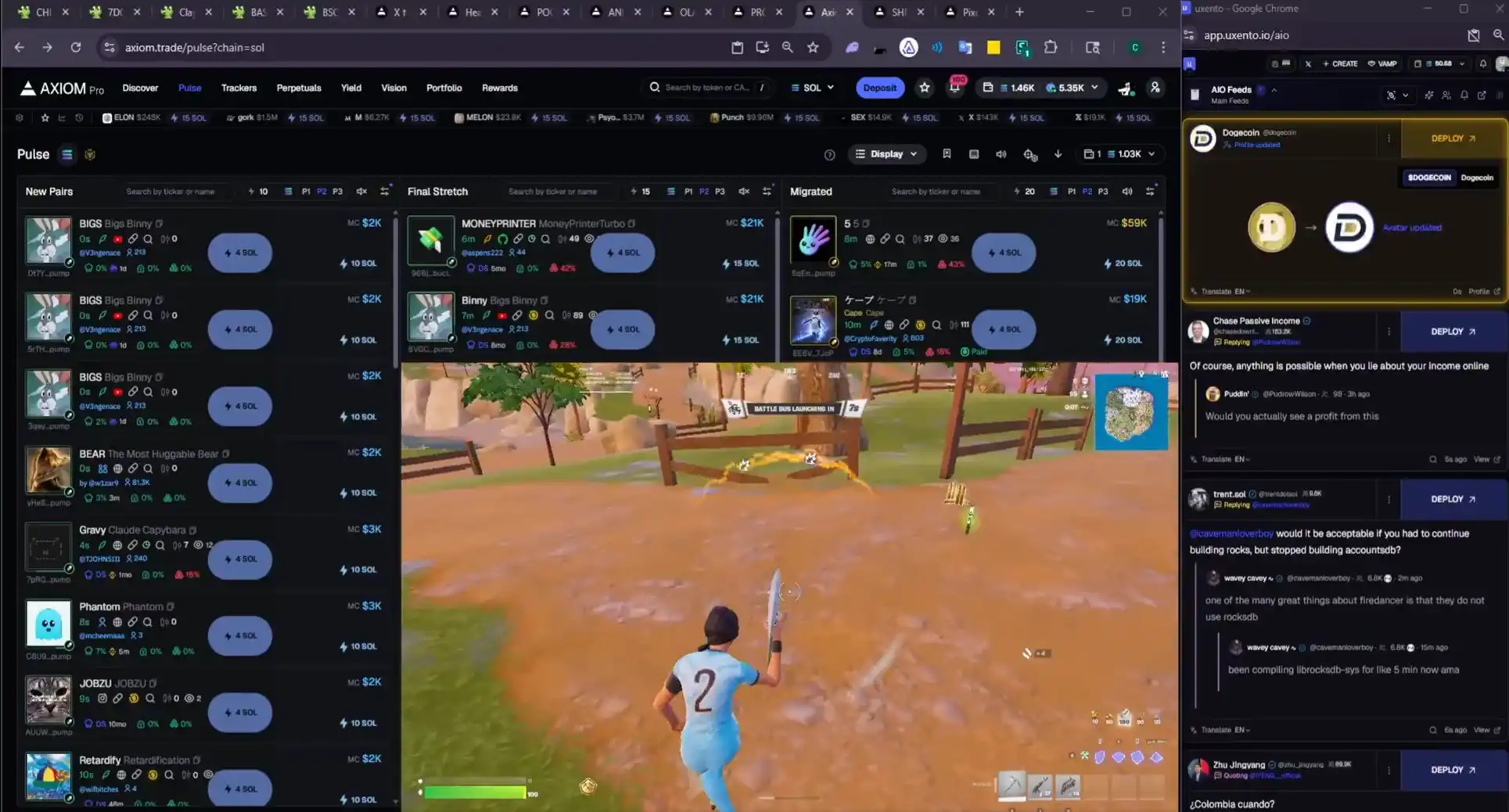 他立马切出游戏,还没来得及搜索可能的 ticker,新代币监控中就已经跳了出来,于是果断买入。这个切掉游戏画面到买入的动作,又是仅用了 2 秒钟。放弃一场堡垒之夜游戏到加入一场 meme 币游戏后,他一路卖卖卖,又收获了 5000 美元。