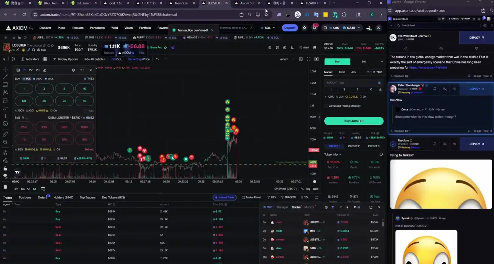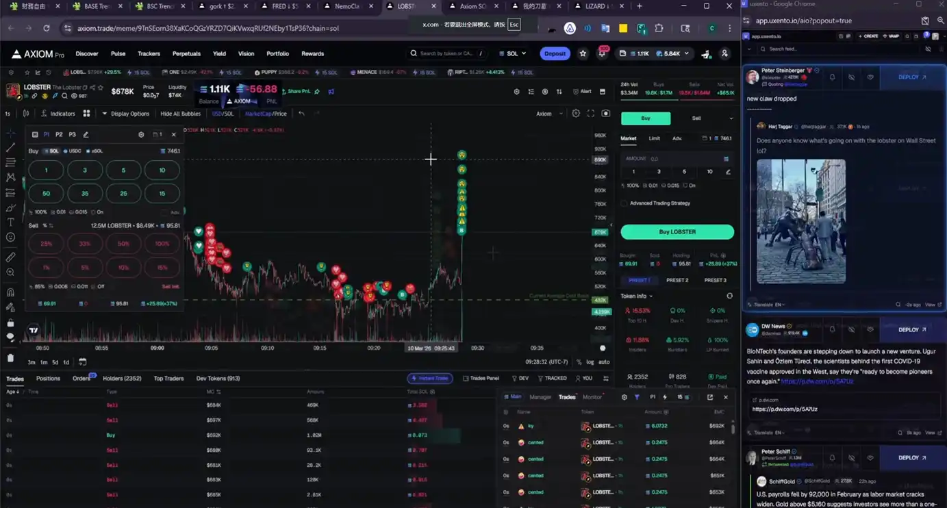 先是「龙虾」创始人引用了一条「华尔街有龙虾」的推文,他立即根据推文关键词,选中了 $LOBSTER 这个标的并买入:
