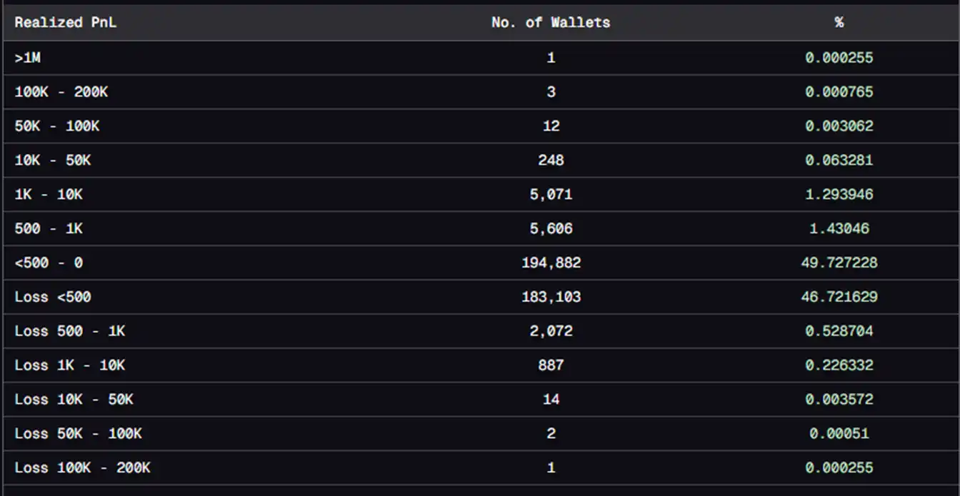 而本月对 pump.fun 用户的交易情况统计中,有约 47.5% 的用户处于亏损,约 49.7 的用户只兑现了不超过 500 美元的利润。如果能够兑现出 500 美元以上的利润,你就已经是市场上前 1.36% 的佼佼者。