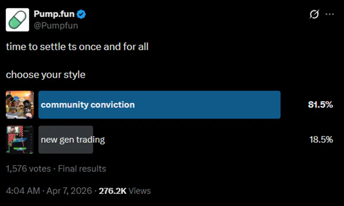 在 pump.fun 官推发起的最新投票里,「社区信念」仍然以压倒性的优势获胜。大家都怀念过去那个有趣也简单、拿着 meme 币可以安心入睡的时代。