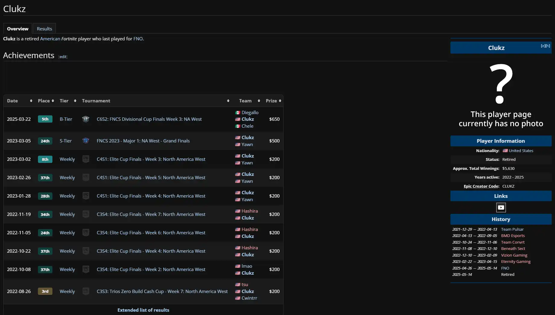 在 2021 年至 2025 年间,他曾为 7 支不同的战队效力。作为曾经的堡垒之夜职业选手,他的职业生涯并不算成功,生涯累计总奖金只有 5630 美元。他曾参加过 S 级别的区域性赛事,但最好成绩也只有第 24 名。在相当多的小型周赛上,他也从未夺冠,最好成绩只有季军。