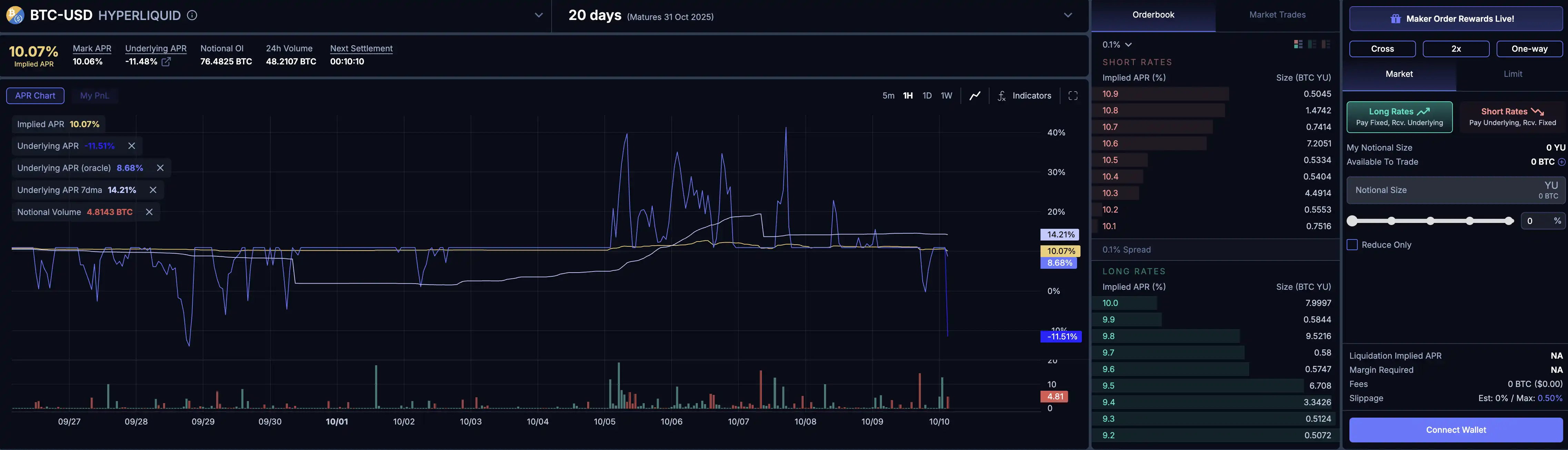 至於 Boros 的利率交易,走的是訂單簿 + 保證金的形態,體驗更像期貨交易平台,可以做多或做空資金費率。目前 Boros 已在 Arbitrum 主網上線,首批支援 BTC/ETH 永續合約市場的資金費率交易(已接取 Binance 和 Hyperliquid 的 BTC/ETH 市場),用戶在 Boros 上掛單撮合交易 YU,就能獲得對應資產未來資金風險的多頭或空頭費率。