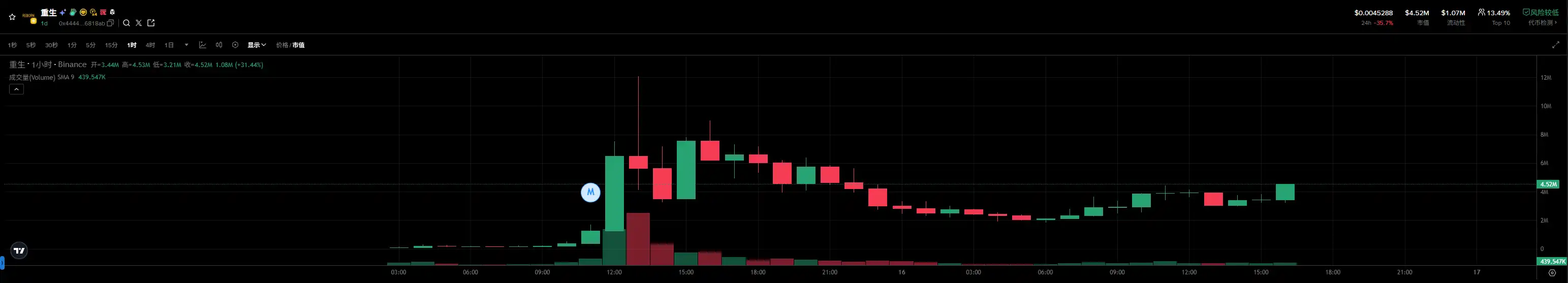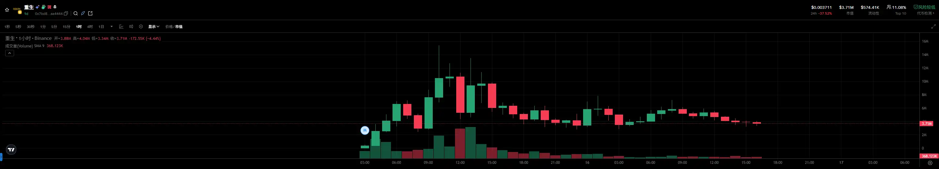 先聚集起玩家們的共識並跑出來的「重生」幣,是合約地址以「4444」為結尾的。從下面的 K 線圖可以看到,從成功發射出來後,合約以“4444”為結尾的“重生”幣就開始了上漲,最高市值一度突破 1500 萬美元。