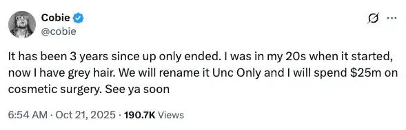 一小時後,Cobie 在 X 上發了一條推文:「UpOnly 結束已經三年了。開始做節目時我才 20 多歲,現在我都有白頭髮了。我們要把它改名叫‘大叔專場’(Unc Only),然後我會花 2500 萬美元做整容手術。 style="text-align: center;">