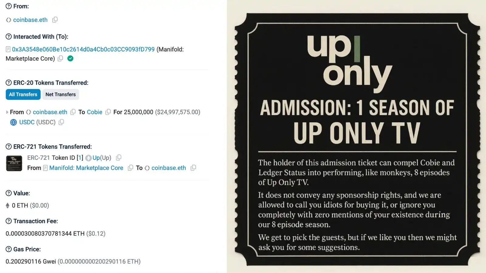 2025 年 10 月 21 日,一個標記為「coinbase.eth」的以太坊錢包,向加密貨幣 KOL Cobie 轉出了 2500 萬 USDC,用於購買一個叫做 UpOnly 的 NFT。
