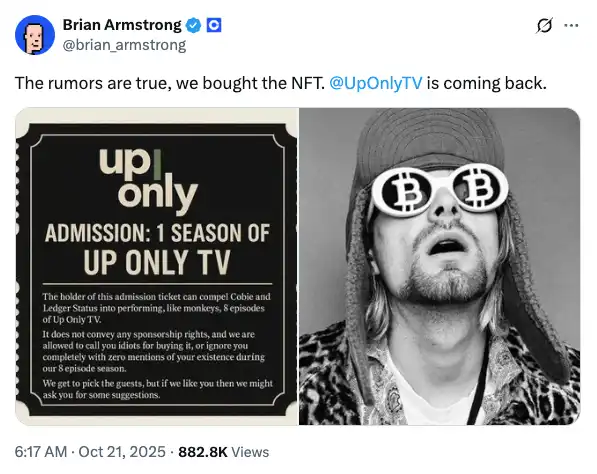 同一時間,Coinbase CEO Brian Armstrong 在社群媒體上確認:「傳言是真的,我們買了這個 NFT。UpOnly 節目要回歸了。」
