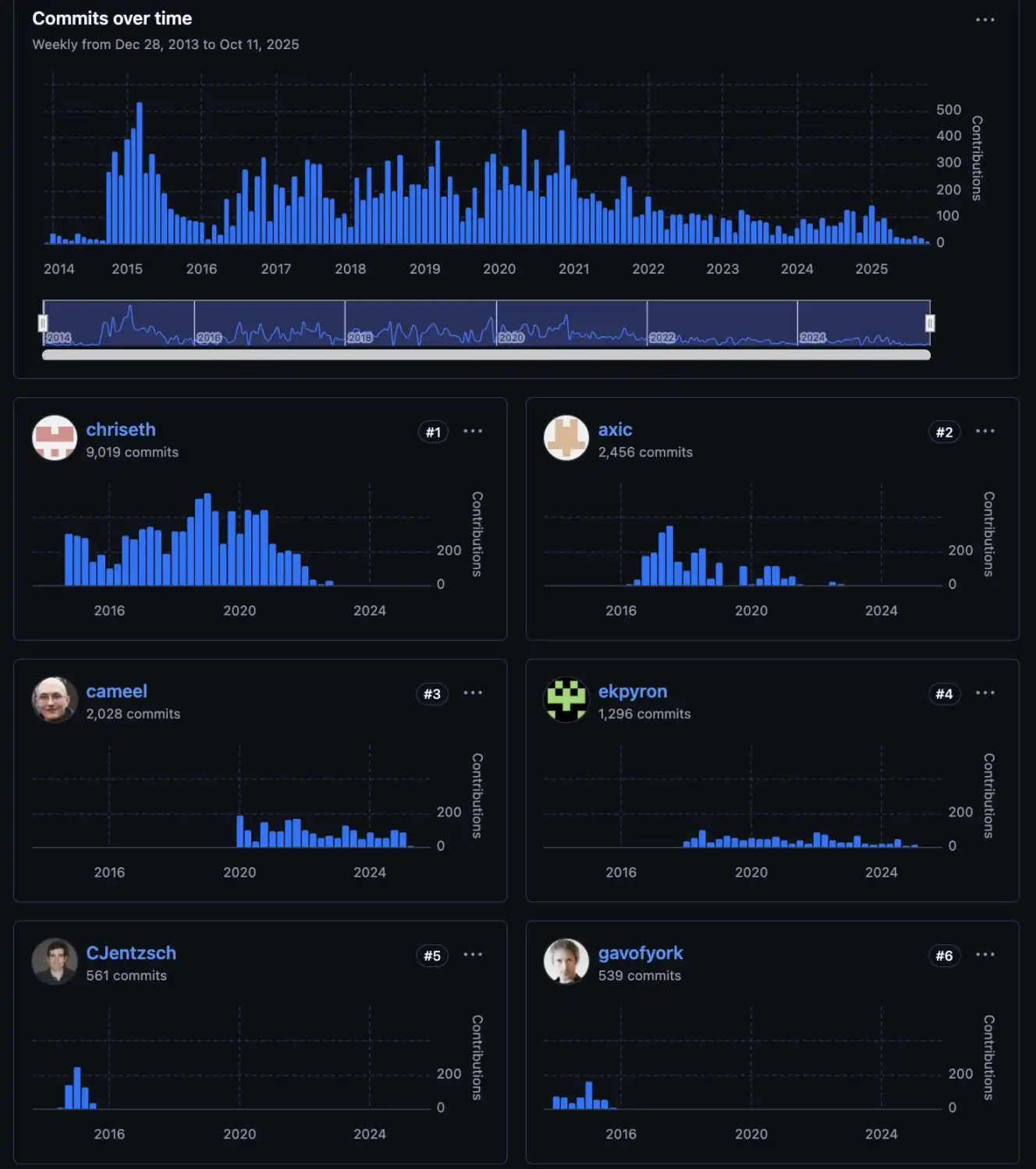 一週前,社群使用者在 X 上曬出了一張截圖並表示,Solidity 語言的頂級貢獻者都幾乎不再繼續進行開發了。只有 Cameel 仍在不斷提出新問題並推進技術進展,但似乎也只是處於維護的模式。其認為社群需要投入更多資源來支持這門程式語言。