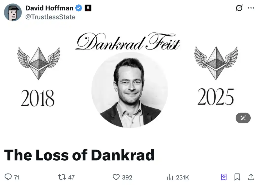根據 LinkedIn,Dankrad Feist 於 2019 年正式成為以太坊研究員,主要研究可擴容以太坊主網的分片技術,目前以太坊擴容路線圖中最核心的部分之一的 Danksharding 就是以其名字命名。 Danksharding 是以太坊實現高吞吐量、低成本交易的關鍵技術路徑,被社群廣泛認為是「以太坊 2.0」之後最重要的升級方向。