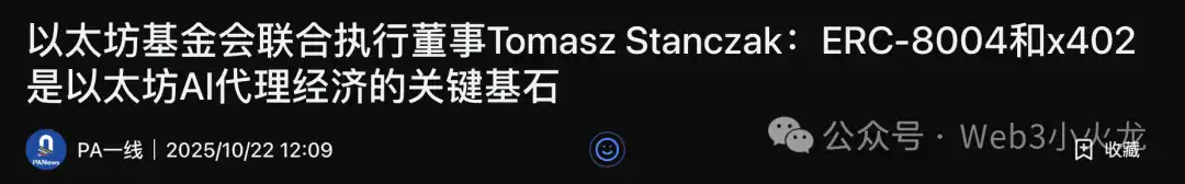 以太坊基金會的策略定位在 ETHShanghai 2025 大會上得到明確闡述。聯合執行董事 Tomasz Stanczak 揭示了未來 AI 代理經濟的基礎設施藍圖:ERC-8004 作為代理功能標準,涵蓋身份、信譽及聲明驗證;而 x402 則專門定義代理間的支付協議,兩者共同構成自主機器經濟的技術基座。