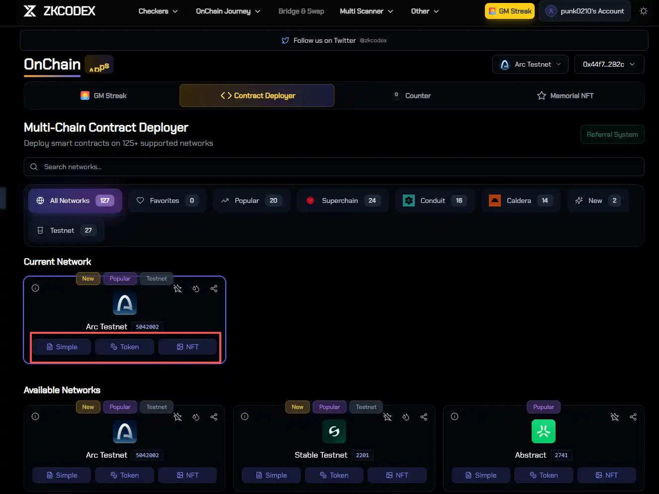 STEP 6. 在 ZKCODEX 平台中選擇 Arc 測試網(連結:https://zkcodex.com/onchain/deploy),連接錢包在部署