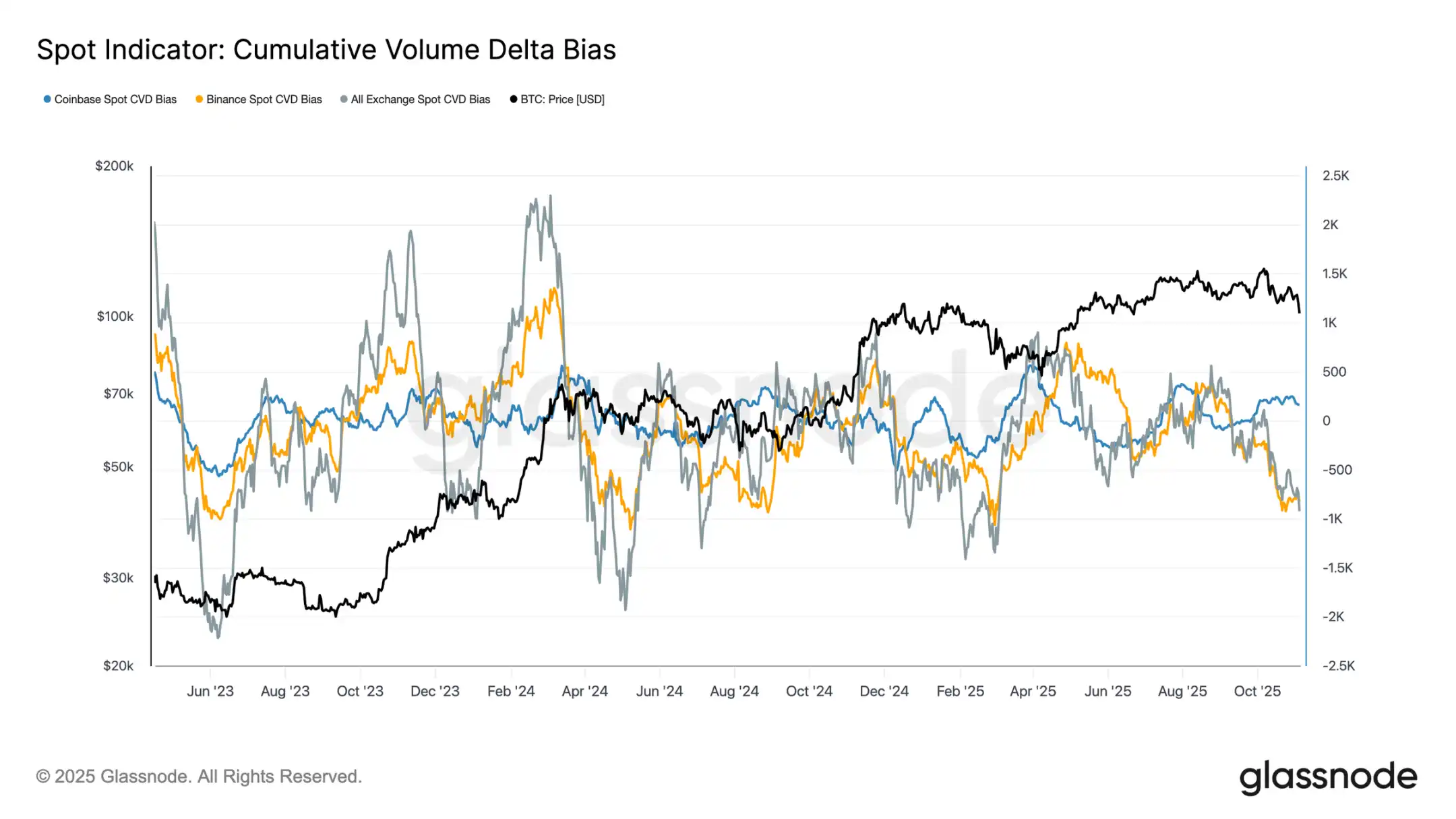 · 美國現貨比特幣 ETF 出現持續資金流出(每日流出 1.5 億 - 7 億美元),主要交易所的現貨累計成交量差值(CVD)顯示賣壓持續,自主交易需求減弱。