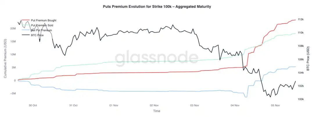 觀察 10 萬美元行使價的賣權溢價,可進一步洞察當前情緒。過去兩週,賣權淨溢價逐步上升,昨日隨著多頭市場可能終結的擔憂加劇,溢價大幅飆升。拋售期間賣權溢價衝高,即便比特幣在支撐位附近企穩,溢價仍維持高位。此趨勢確認對沖活動持續,交易者仍選擇保護而非重新承擔風險。