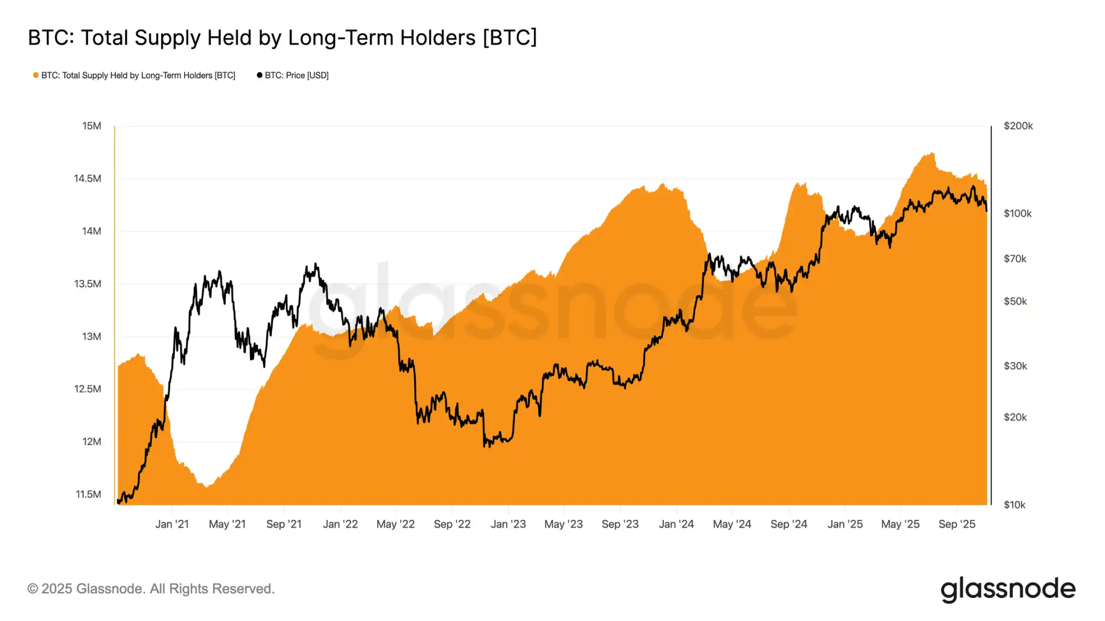 · 自 7 月以來,長期持有者的比特幣供應量減少了 30 萬枚,即便價格走低,減持仍在持續——這與本輪週期早期“逢漲拋售”的模式不同。