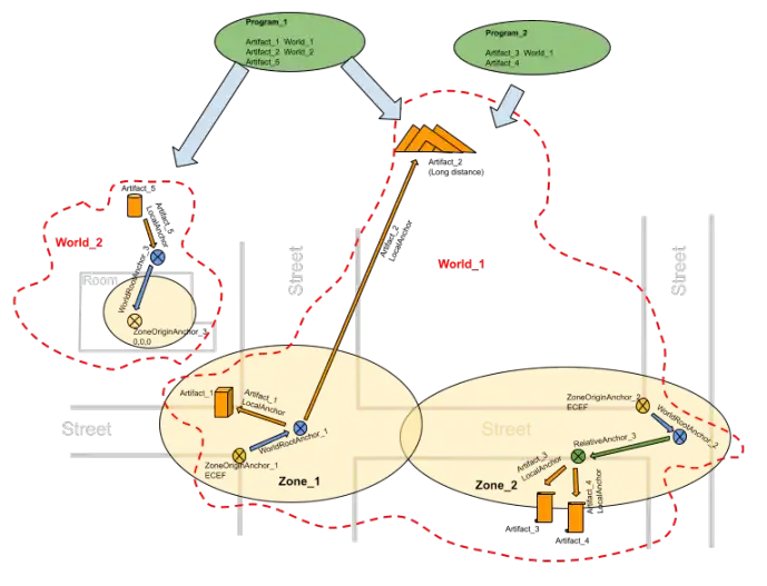 建構現實世界與虛擬世界共存的核心則圍繞著空間錨點展開。從技術實現的角度,現實世界無法直接被編程,與虛擬世界的連結是透過關聯現實世界中的錨點並映射出基於實體空間的虛擬空間。比喻的話,對機器人和 AI 來說,顯示世界就是黑夜裡的海洋,而這些錨點就是一個個的燈塔,為矽基智能在顯示世界裡照亮每一片區域。