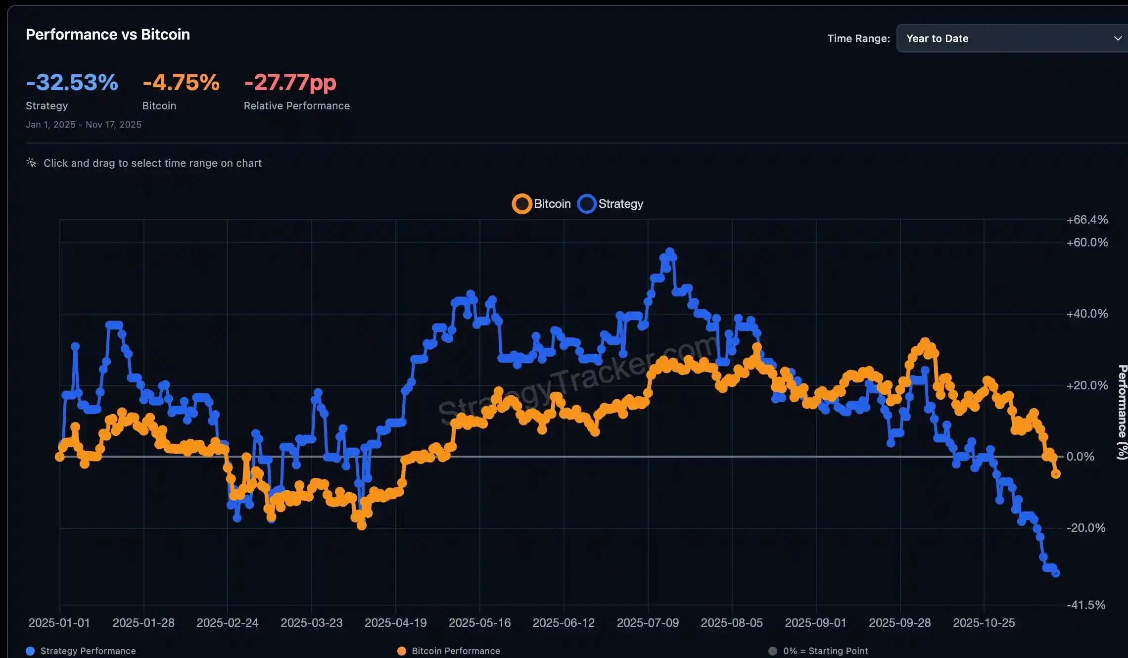 從今年年初算的話,BTC 只跌了 4.75%,但 MSTR 股價已經跌了 32.53%。