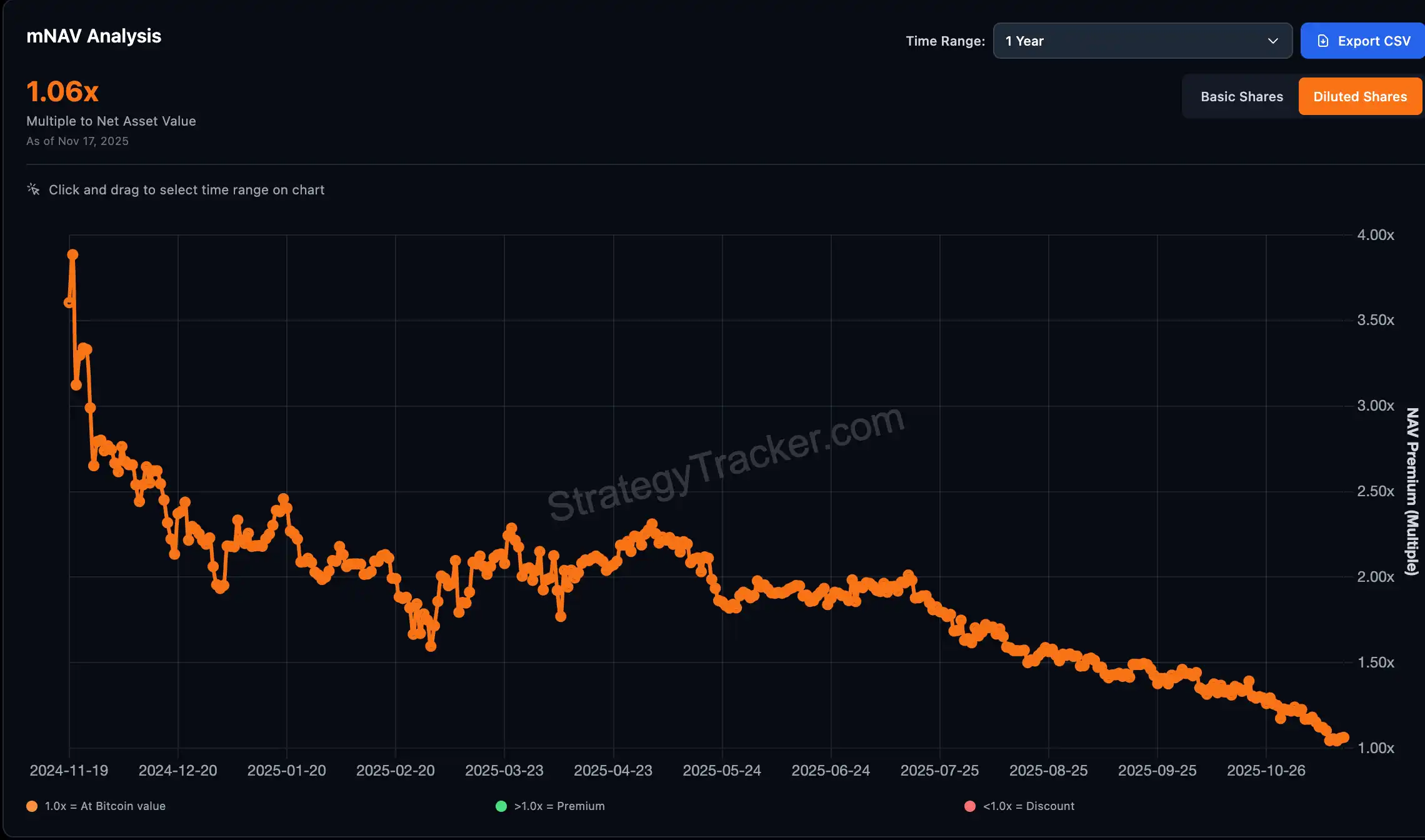 MSTR 的 mNAV 已經要跌到 1 以下了。