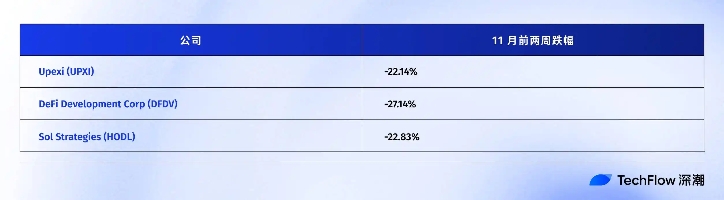 這些公司把 ETH 作為財庫主要資產。 11 月前兩週,ETH 價格從$3,639 跌至$3,120(-14.3%),但它們的股價跌幅達到 17-20%。