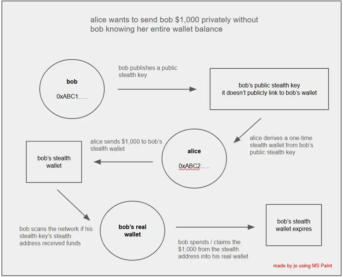 >p根據該密鑰對,Alice 派生出一個完全隨機且一次性的隱蔽地址,並向該地址轉賬 1000 美元- Bob 掃描網絡,查看與他隱蔽密鑰對所對應的地址是否收到了資金